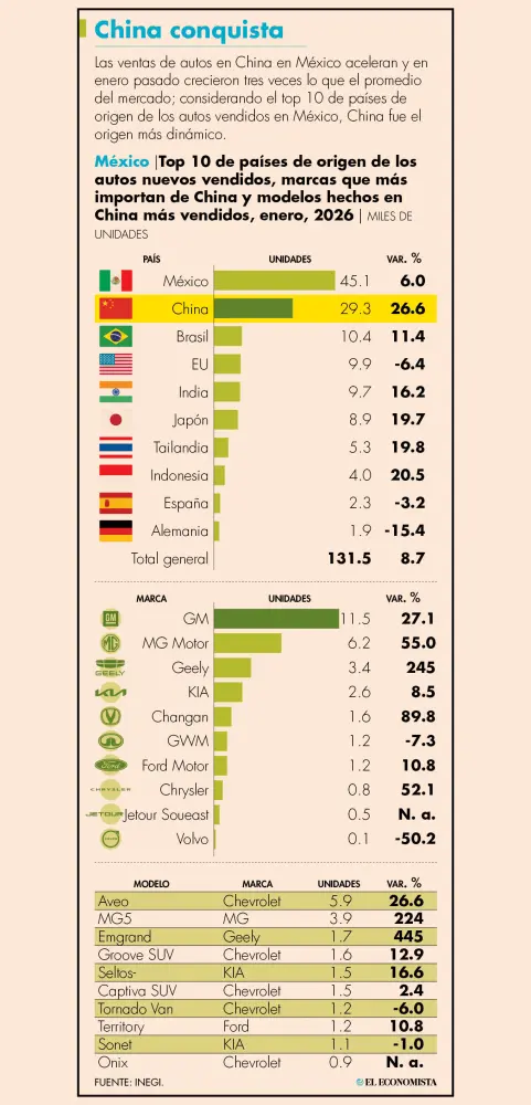 De acuerdo con el reporte automotor de la AMDA a enero del 2026, General Motors se coloca como la mayor importadora de autos de origen chino con 11,469 unidades; seguido de las chinas MG con 6,198 autos; y Geely con 3,536. Además de la coreana KIA con 2,610 autos; Changan con 1,630 autos; Great Wall Motor con 1,236; seguido de Ford 1,229 unidades y Chrysler con 765 vehículos.